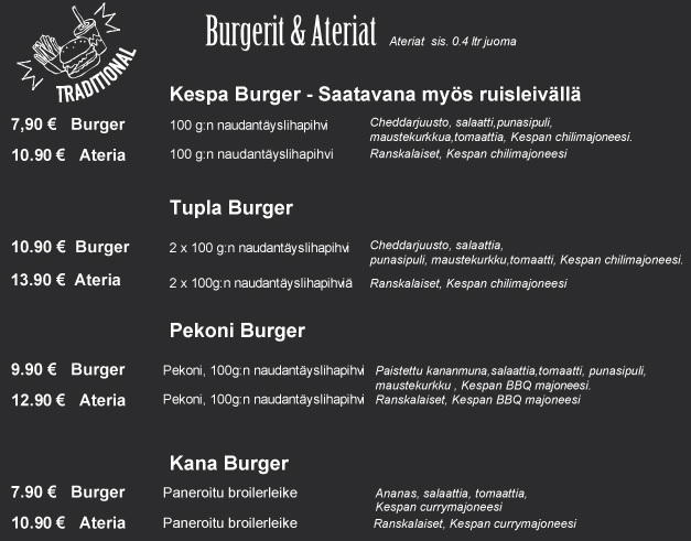 - maittava kolmen ruokalajin buffet - päivittäin vaihtuva päivän leike - monipuoliset burgerit ja -ateriat - lounge tilojen vuokraus - pikkunälkään - kahvia - leivonnaisia - voileipiä ym.